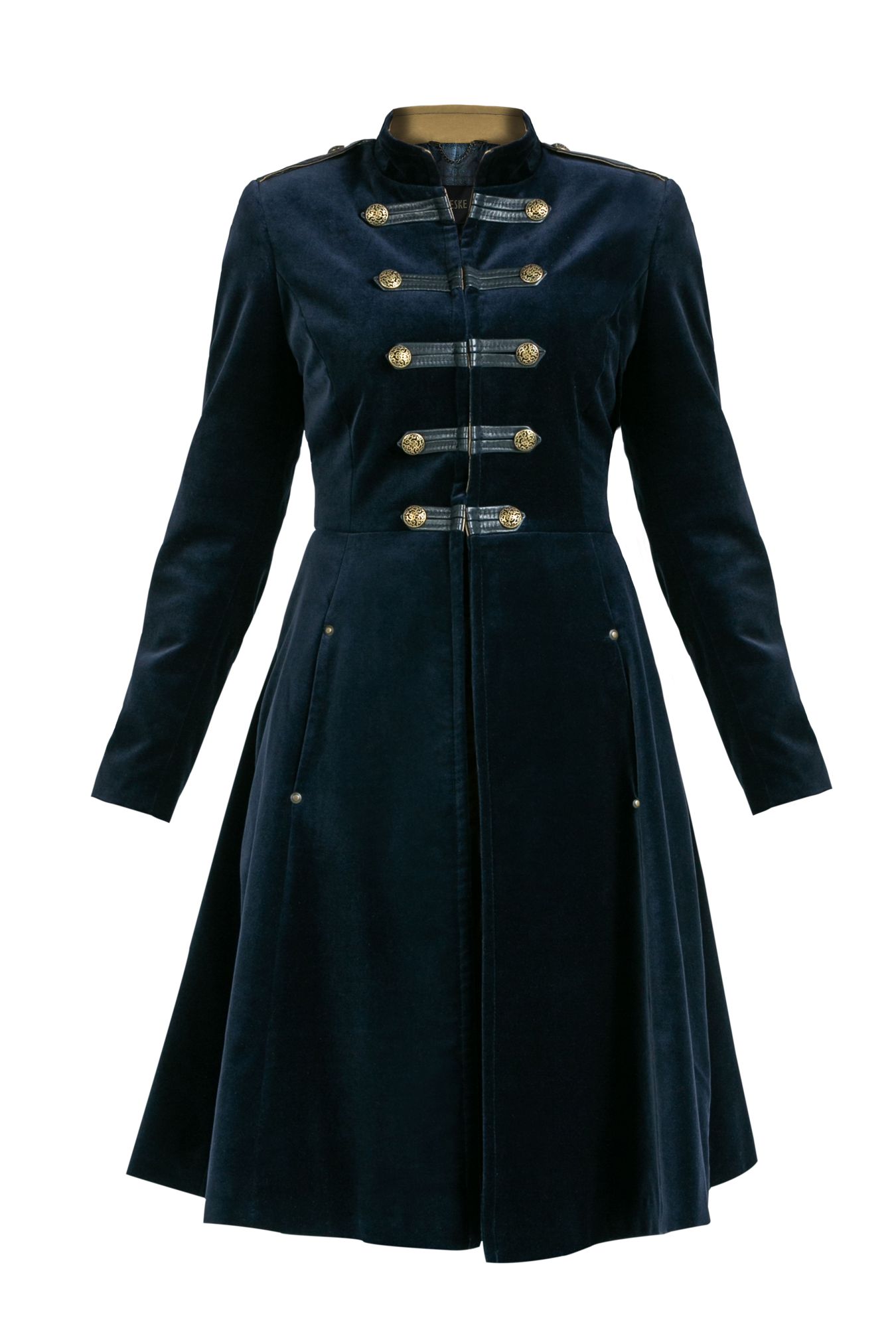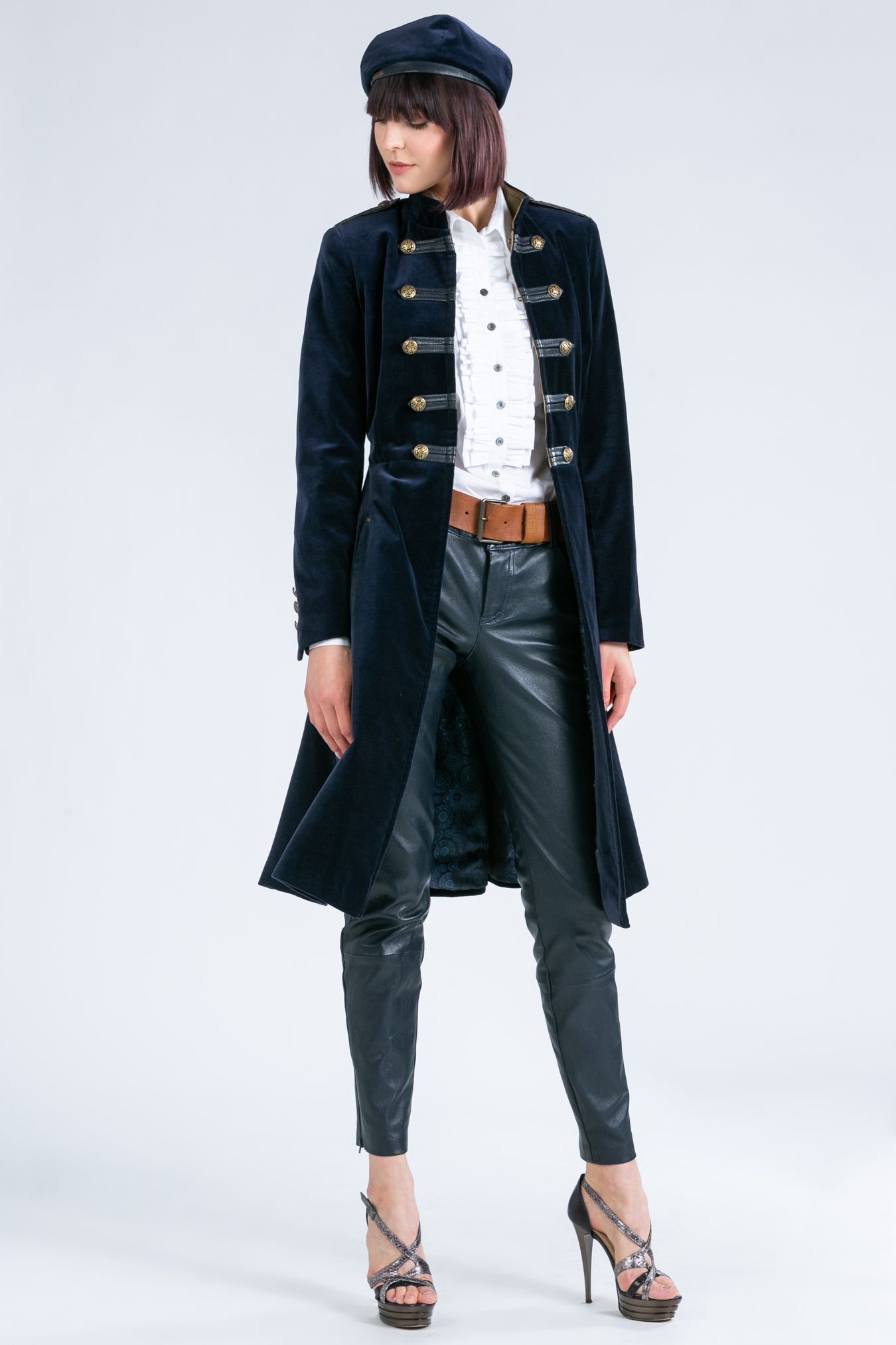 This perfectly tailored women's coat is the quintessence of elegance and femininity. It was made from noble, high-quality cotton velvet in a deep navy blue color combined with natural leather. It’s impressive not only because of its unique cut, but also because of its high quality. It's a real masterpiece. Ideally suited for both a night out and for work. It will make you feel extremely elegant and chic. Looks great in combination with a ruffled shirt, leather pants and high heels.