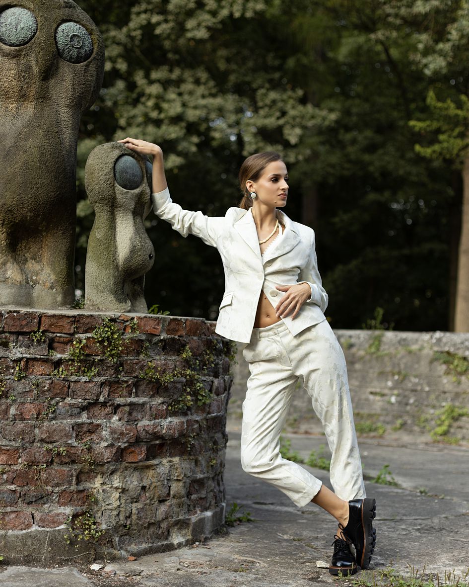 Our collection includes a jacket in the "Bar jacket" style in two color versions. It can be combined with a maxi or midi skirt or chinos or cigarette pants.