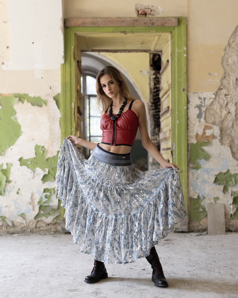 Our charming maxi skirt inspired by the boho-chic style – is made of ruffled ruffles in grey silk chiffon with brocade. Details in the form of decorative ribbons sewn along the hips and ruffles give it a unique and slightly hippie character. The styling complemented with appropriate accessories will certainly guarantee a very original, unusual outfit. It will perfectly match our jacket with fringes in grey and silver and a boho bag. Skirt perfect for everyday wear and all family celebrations.