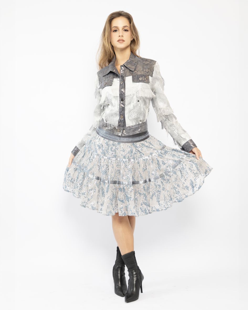 Our charming skirt inspired by the boho-chic style – is made of ruffled ruffles in grey silk chiffon with brocade. Details in the form of decorative ribbons sewn along the hips and ruffles give it a unique and slightly hippie character. The styling complemented with appropriate accessories will certainly guarantee a very original, unusual outfit. It will perfectly match our jacket with fringes in grey and silver and a boho bag. Skirt perfect for everyday wear and all family celebrations.